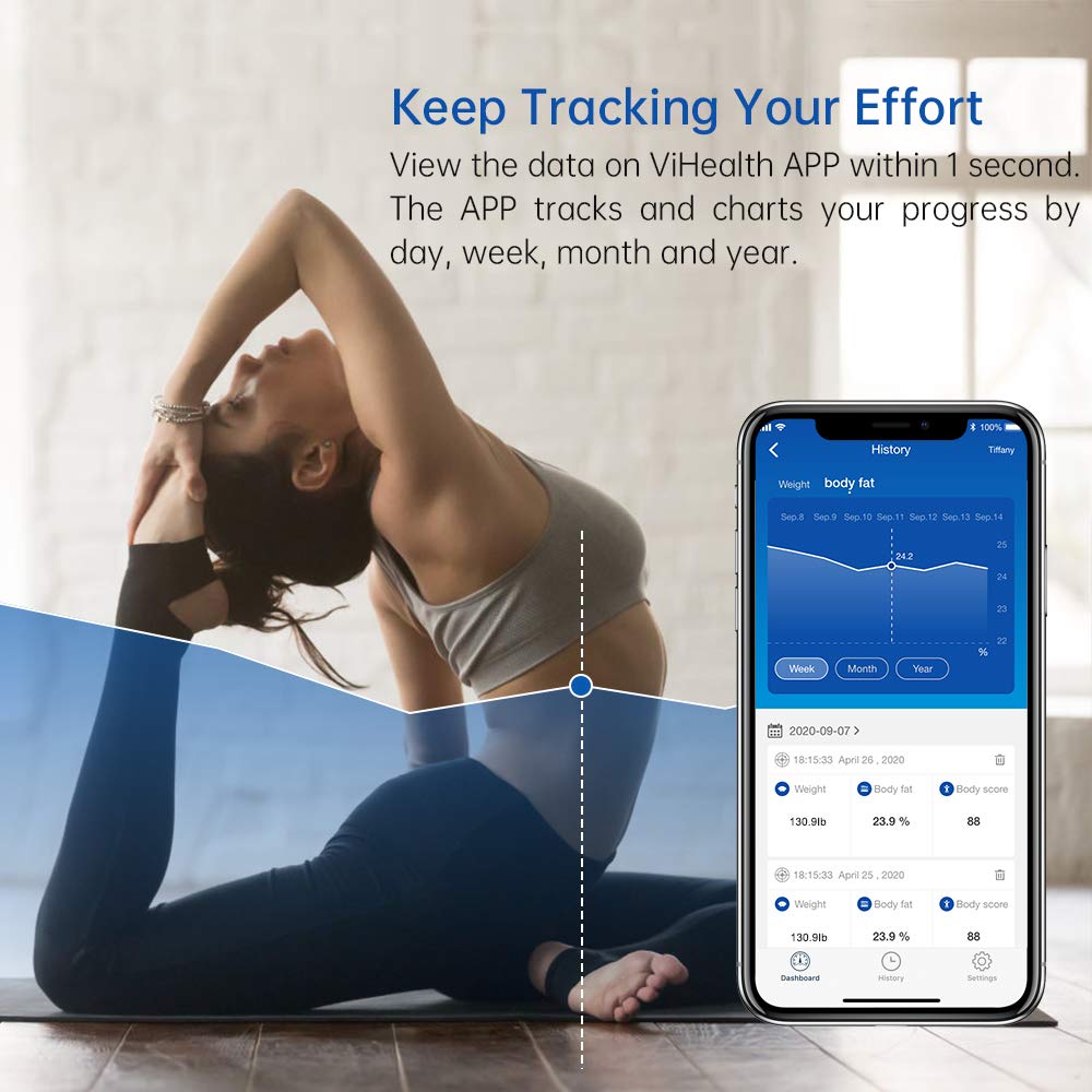 • Smart Data ManagementгЂ‘With Bluetooth 4.0 BLE and free, user-friendly ViHealth APP, it syncs the real-time data onto your smartphone automatically. You can view the reports even when the scale is off-line. It tracks and charts your changes in body weight and body fat by trend graphs of daily, weekly, monthly and yearly. What’s more, it’s also possible to filter body fat records by time and update trend charts.