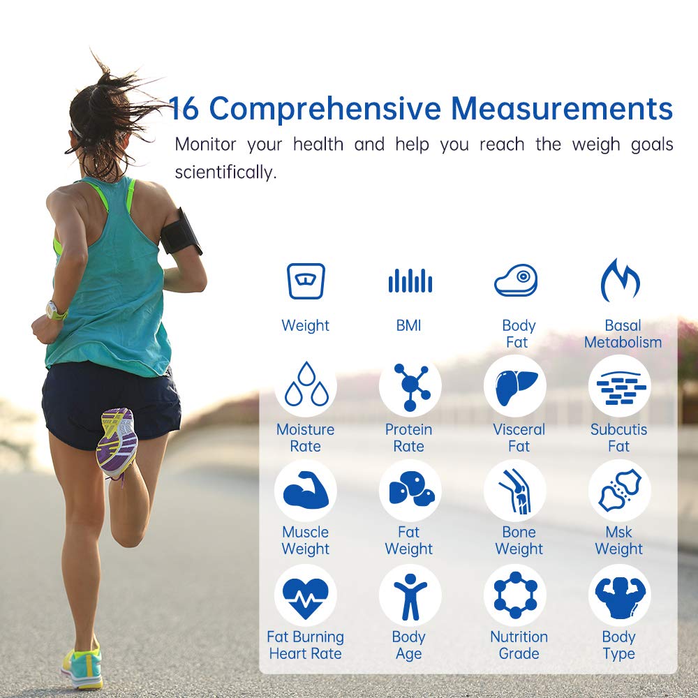 • 16 Health Metrics about Your BodyгЂ‘Based on the BIA technology, the body weight scale accurately monitors and syncs 16 body compositions to your APP, including Body Fat, Visceral Fat, Body Water, Muscle Mass, Bone Weight, Protein Rate, BMI, and More! It gives you an inside look into your body in time and helps you track weight loss and health progress easily on your smartphone.