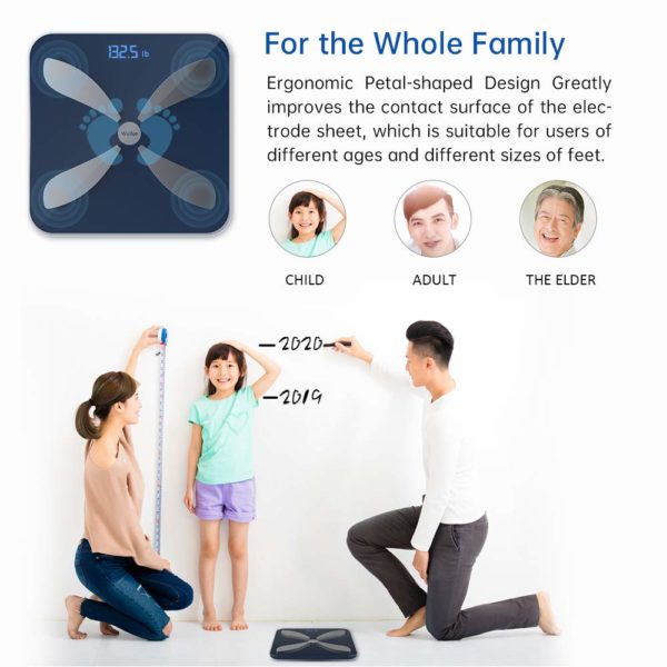 • One Scale for Whole FamilyгЂ‘It can store the measurement data of up to 20 different users in a single APP account. Through petal-shaped electrodes, even babies can easily measure body fat on this weight scale. The scale immediately shows the measurement once you step on it, making weighing as easy as pie.