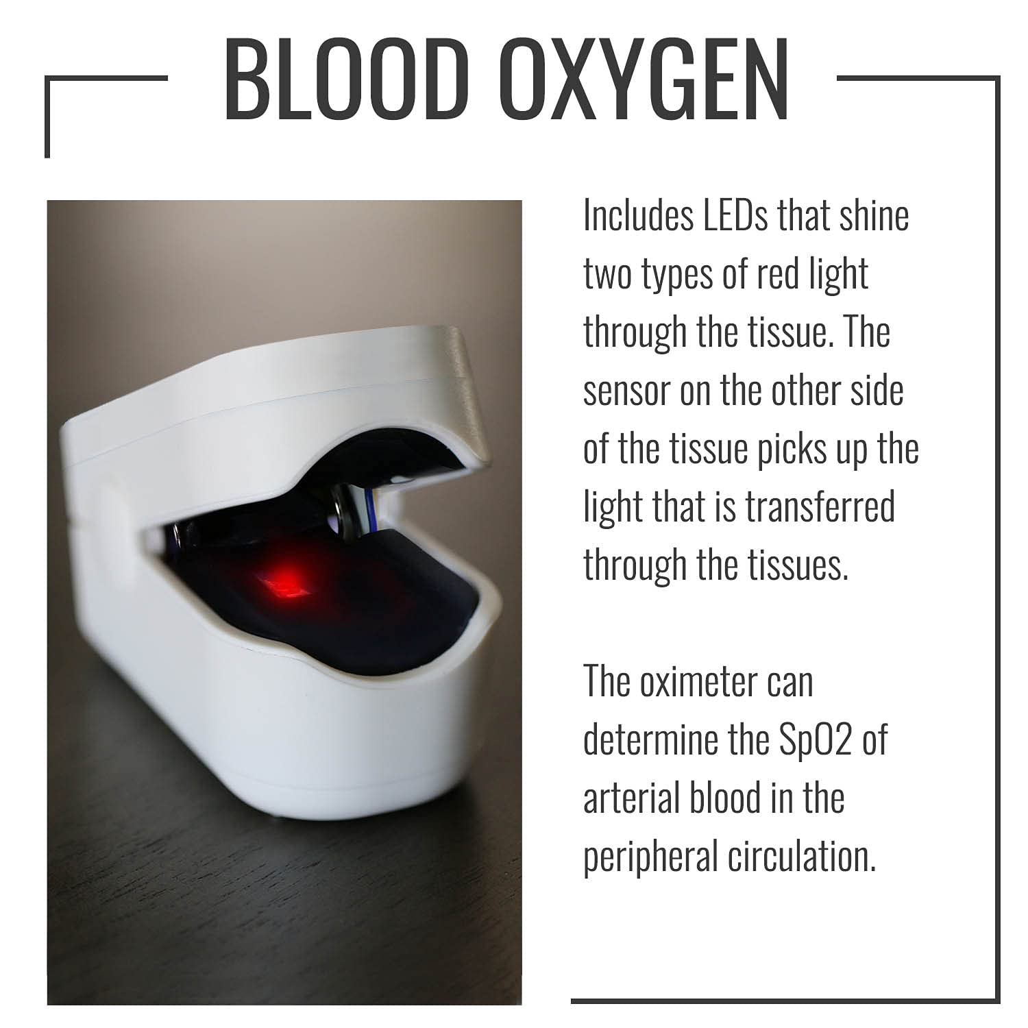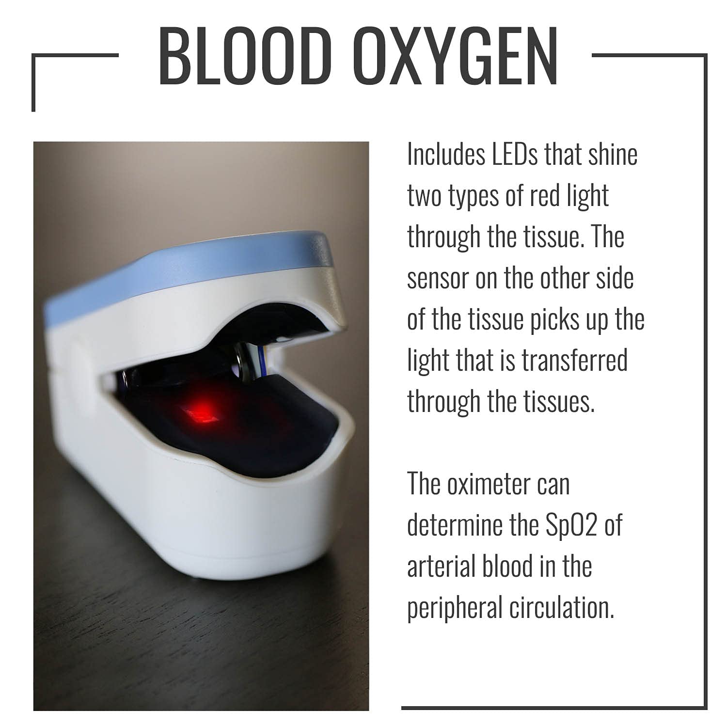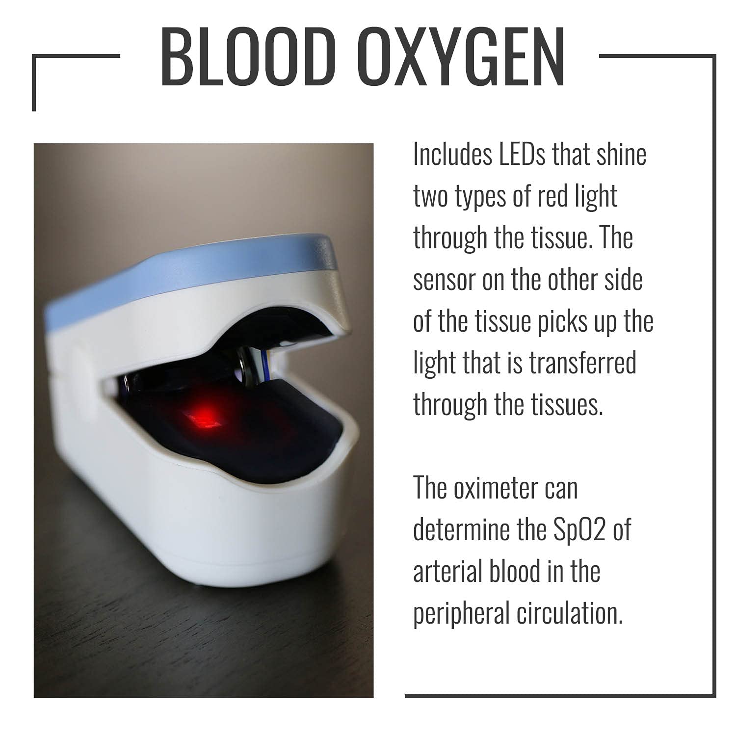 The pulse oxygen saturation is the percentage of HB02 in the total HB in the blood, so-called 02 concentration in the blood. It is an important bio-parameter for respiration. The pulse oximeter is a portable, convenient, non-invasive device, used T monitor arterial hemoglobin oxygen saturation (Sp02) and pulse rates. This unit is designed for adult patients (weight > 60 lbs.) and pediatric patients (weight 44-60 lbs.). it’s recommended to use it on the index finger, middle finger or ring finger as the best suitable location for measurement. This fingertip pulse oximeter is not a medical device and cannot be used for medical diagnostic or treatment activities.
