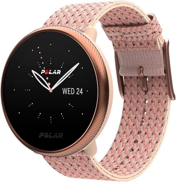 - A Hi Priscila, the Pink/Rose Gold Polar Ignite 2 comes with a woven yarn wristband, it is not silicone. You can learn more about this wristband here: https://www.polar.com/us-en/products/accessories/polar-ignite-woven-wristband